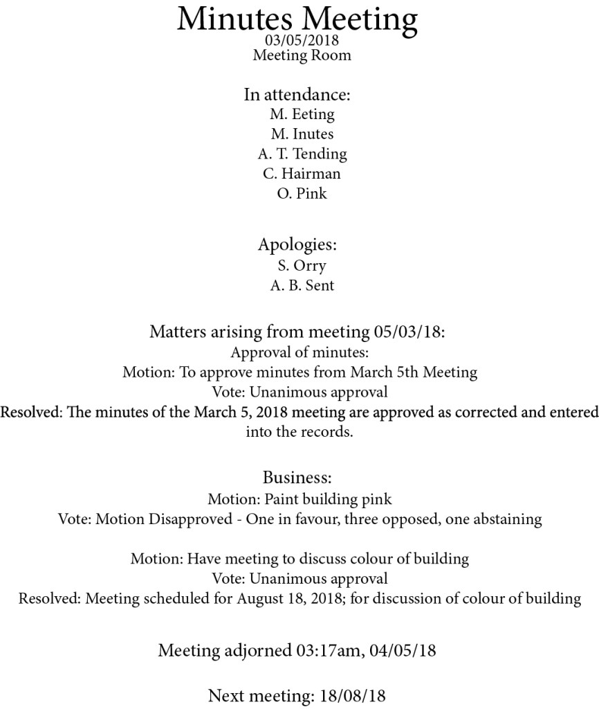Minutes of Meetings are a formal record of a meeting that has taken place. The format of these will include a title, date, location, list of attendees, a notice of any apologies, matters arising from previous meetings, order of business, action points, and the details of the next meeting. (Figures 4 & 5)