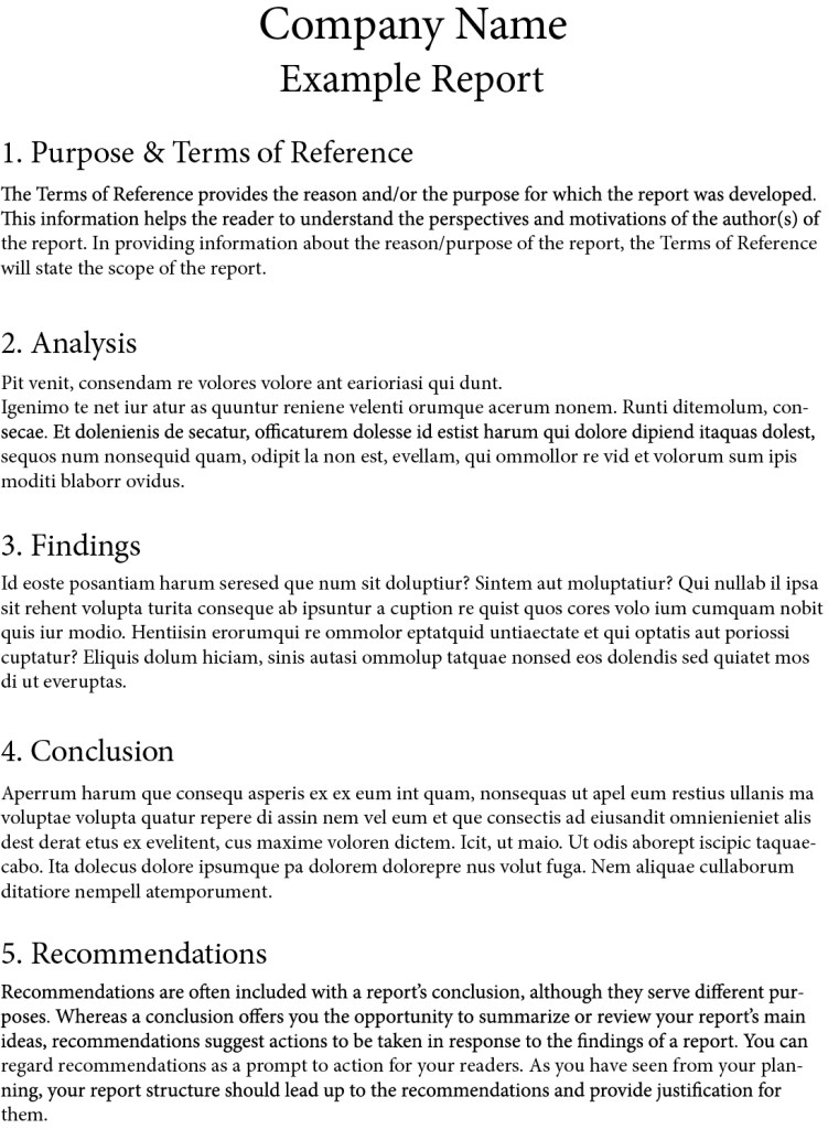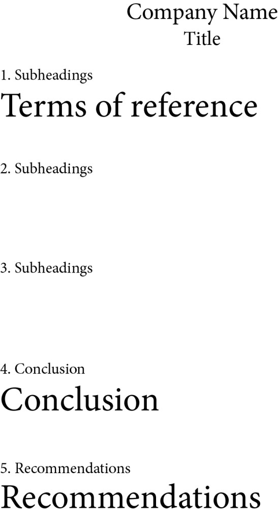 Reports are written statements documenting what has been observed, heard, done, or investigated. The format of a report will often include a title, subheadings, a conclusion, findings, terms of reference, and recommendations. (Figure 7, 8)