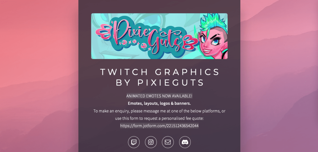 Below are some packages I’ve provided (often along with emotes) for clients.
