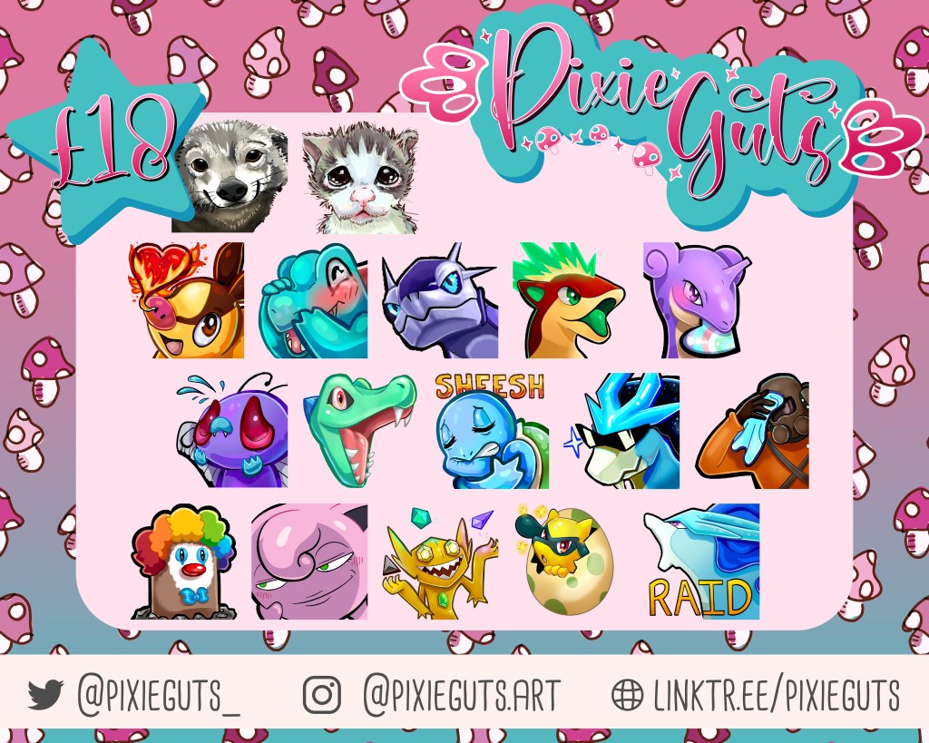 ‘Emotes’ on Twitch are minuscule images for a streamer’s viewers to use to augment discussion, and sometimes heckle their host, while the streamer is live. Think emojis, but much more custom and expressive (and often, made in the context of inside jokes that outsiders of the community may be unfamiliar with/befuddled by). Thanks to the level of customisation available to streamers, there is a thriving community of artists making bank on creating funny little faces for viewers to pull via chatbox. Required sizes for optimal display are 112, 56, and 28px.